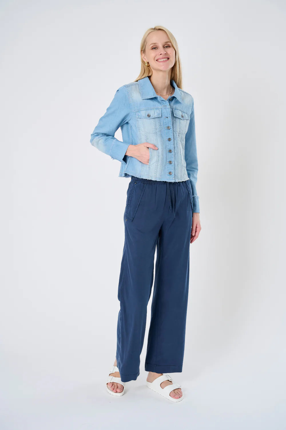 The Charleston Denim Frayed Edge Corset Trucker Jacket is one of those rare finds—familiar, yet refreshingly distinct. Available in two versatile denim washes, this piece brings together vintage trucker charm with a more sculpted, feminine silhouette. Thoughtful seaming, frayed edges, and a flattering ruched back panel create subtle shaping that highlights the waist without ever feeling restrictive.