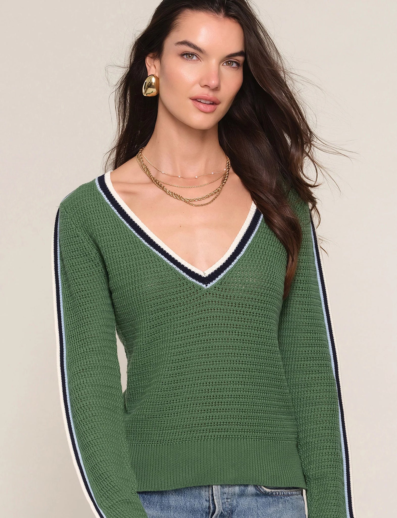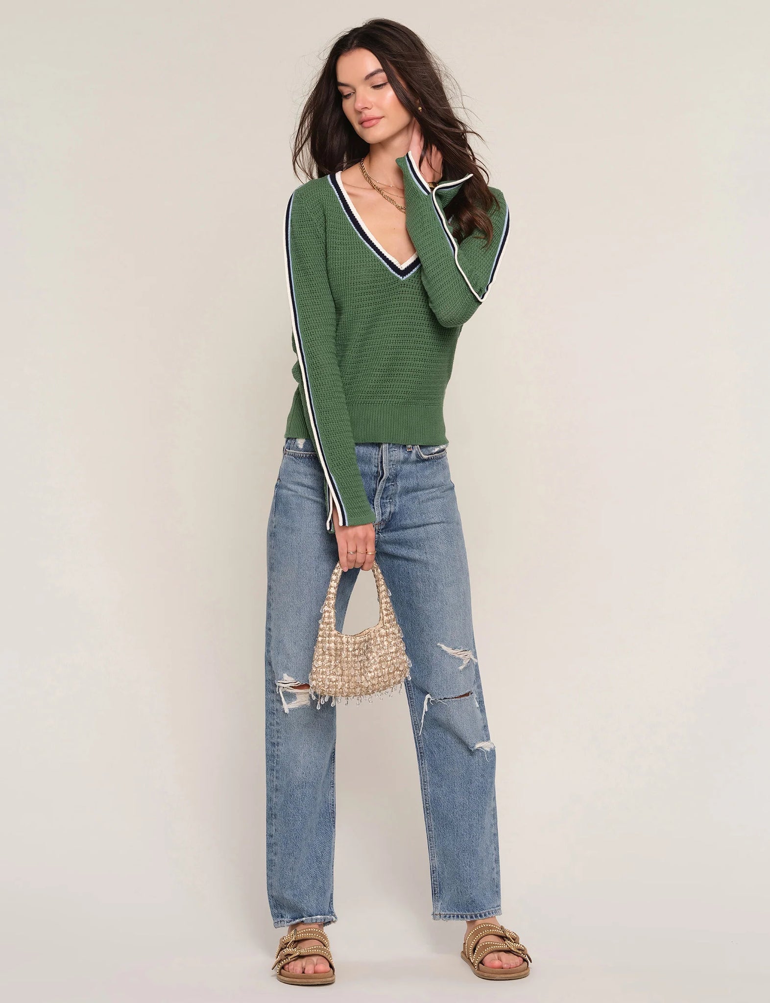 The Kasi Top is a cool, relaxed fit sweater with a v-neck ad textured stitch. It has a contrast tipping along the sleeve and around the neck.