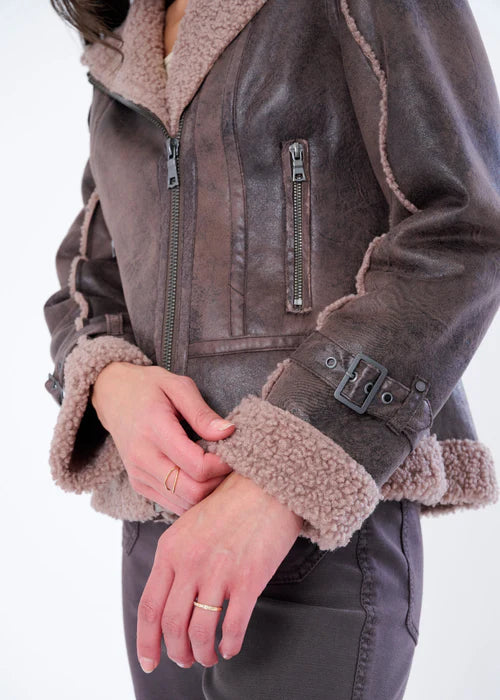 Throw it back and turn heads in the Osha Faux Shearling Distressed Scuba Suede Biker Jacket  is a timeless blend of moto-edge and plush comfort that’s ready to rewrite your fall wardrobe. With its buttery-soft distressed faux suede exterior, warm faux shearling lining, and iconic asymmetrical zip closure, this jacket nods to vintage biker style without losing an ounce of modern refinement.