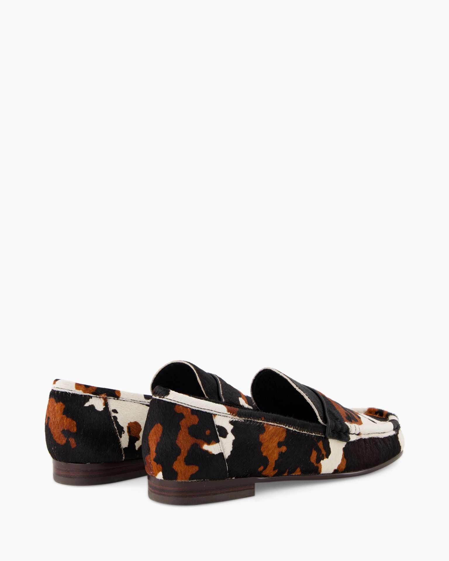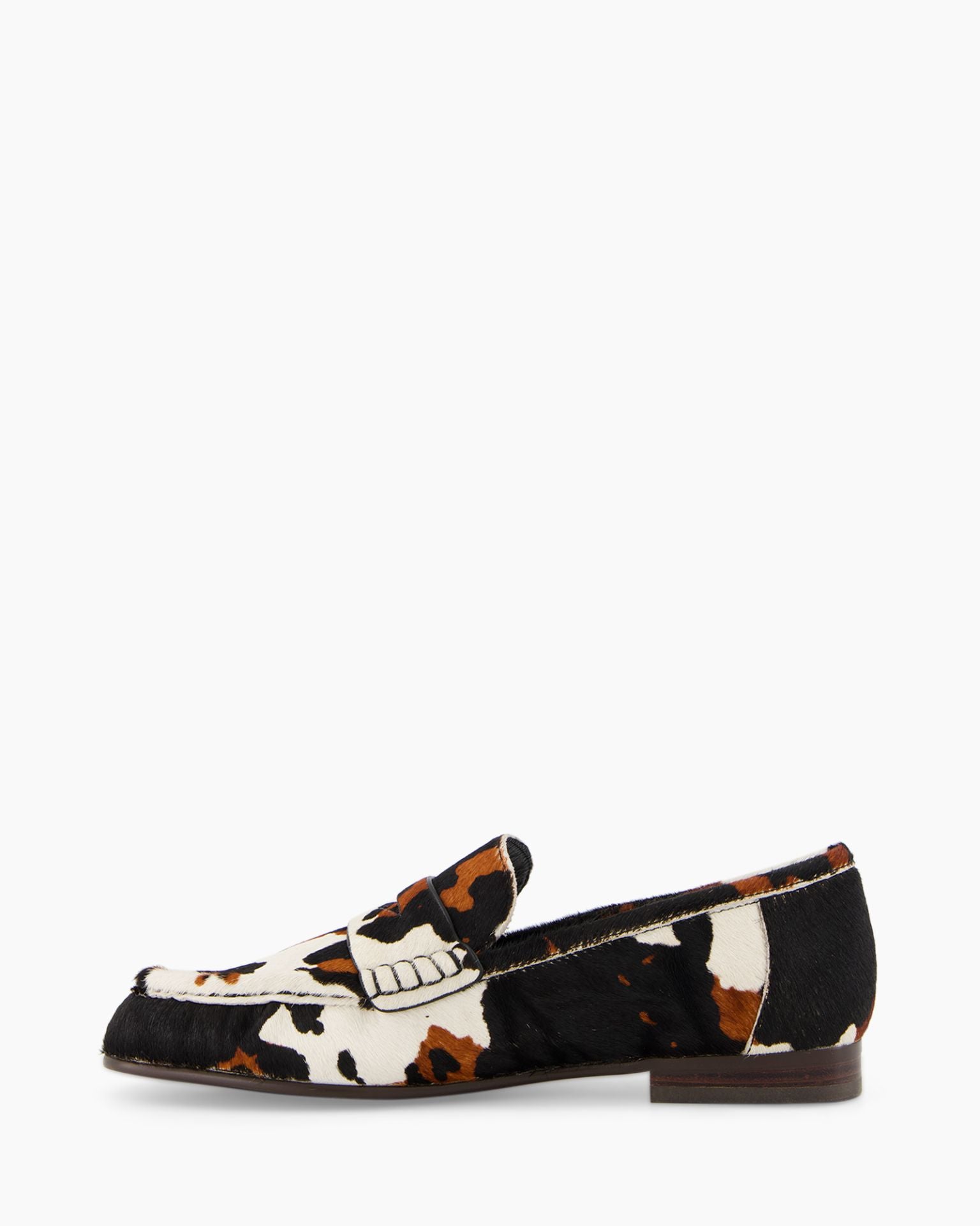 The loafer is crafted from high-quality pony fur, adding to its luxurious feel. The brown pattern combined with black and white accents adds a playful dimension. The subtle stitching along the edges adds a refined touch.