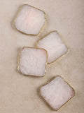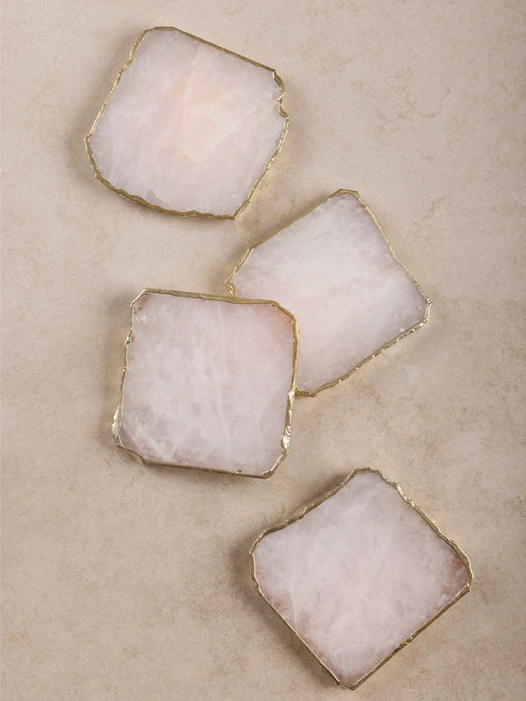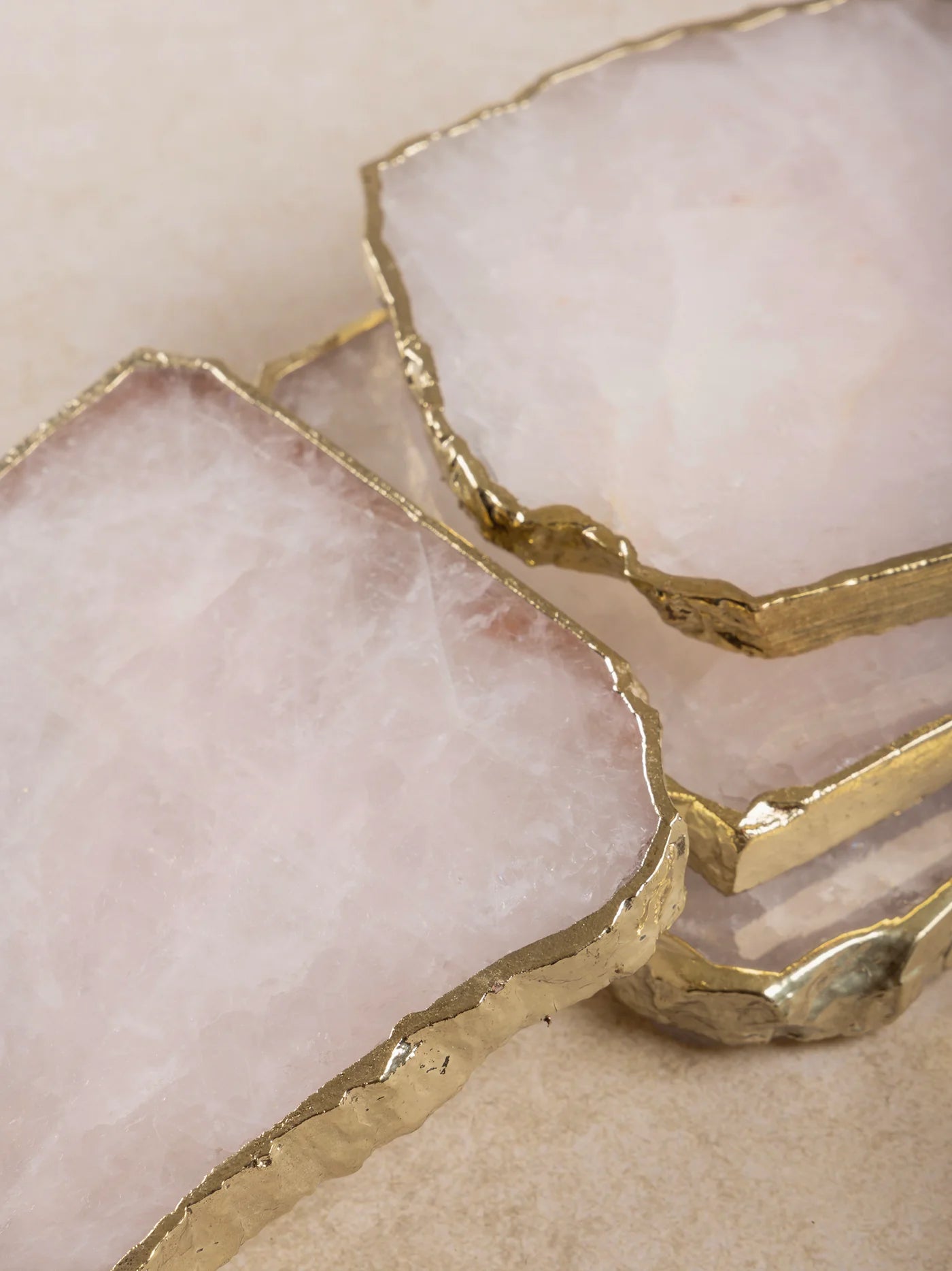 mmerse yourself in the captivating beauty of the Dazzle Coasters, exquisitely crafted from the finest gemstones—Rose Quartz. Each piece radiates its own unique charm, with vibrant hues of purple, pink, and green that create a stunning visual symphony. The elegant chiseled edges, adorned in shimmering gold, enhance the coasters’ allure, infusing your space with sophistication and grace.
