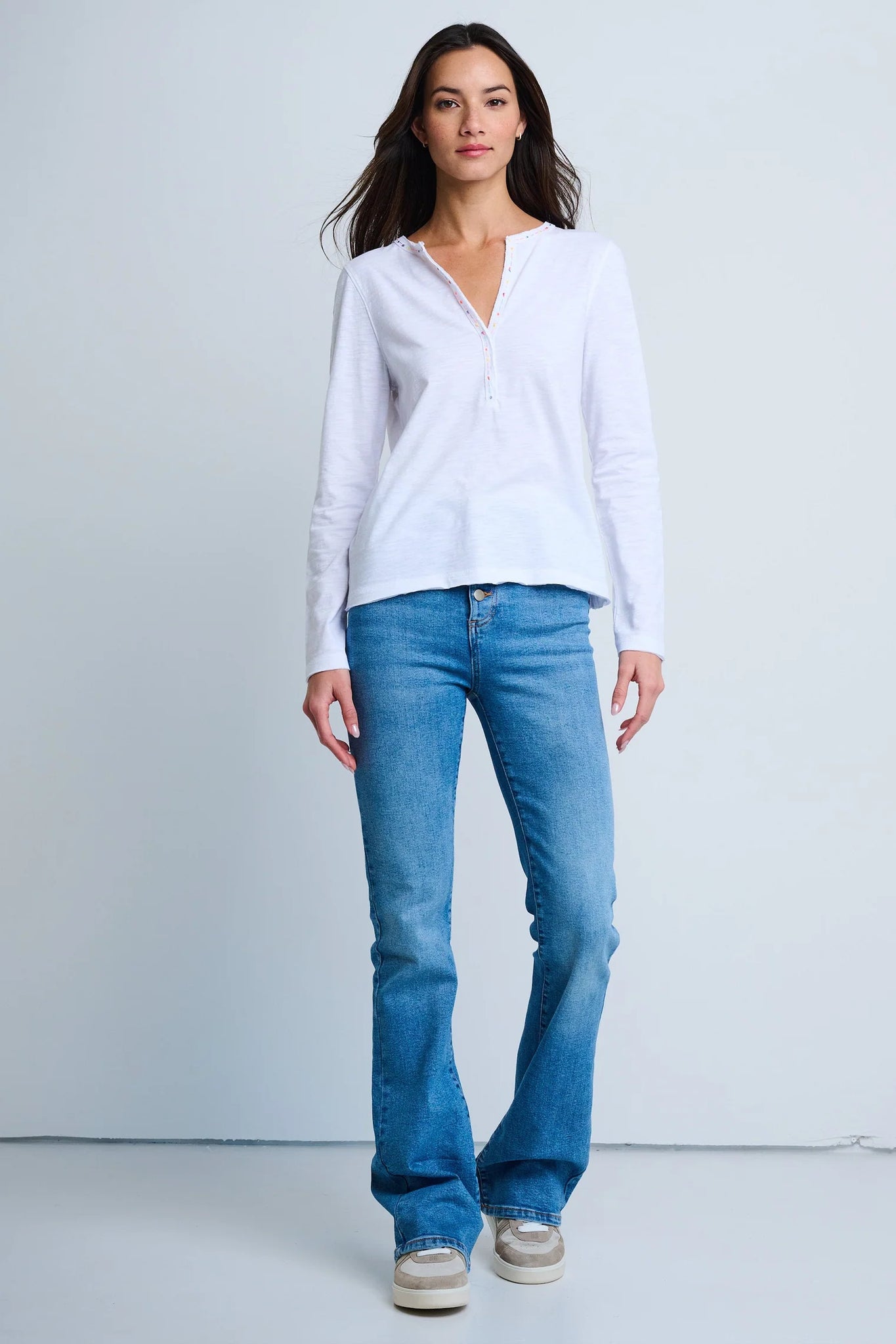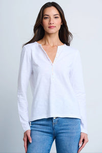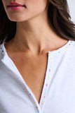 The XO tee redefines casual with elevated details like petite snap closures and rainbow embroidery at the neckline and placket. Designed with a soft split neck and long sleeves, this 100% cotton slub style blends everyday comfort with a hint of playful charm.